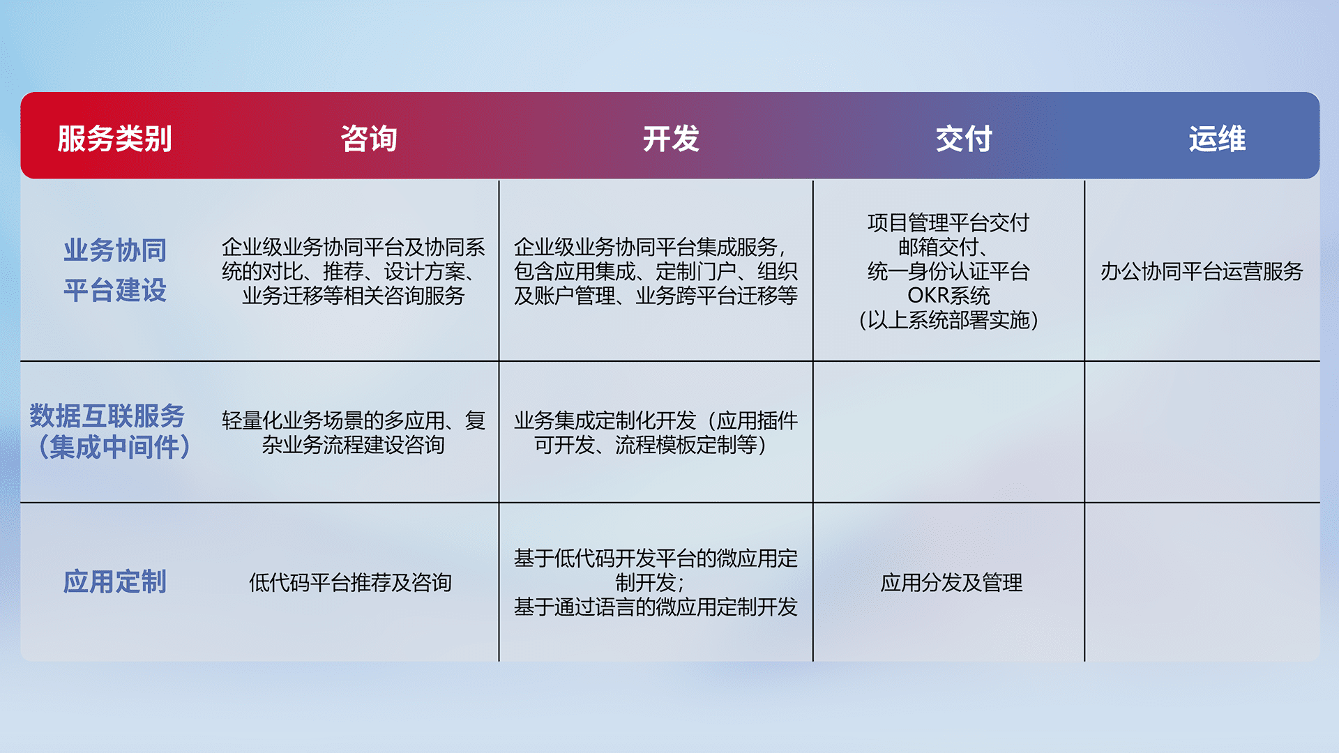 针对钉钉、、、、企微、、、IDaas等平台级产品提供产品的规划、、方案、、、交付、、、定制化开发等服务,,实现如统一协同办公、、、、智能客户服务、、混合会议管理、、智能数据查询、、、、等业务场景,,,实现数字化转型。。。。