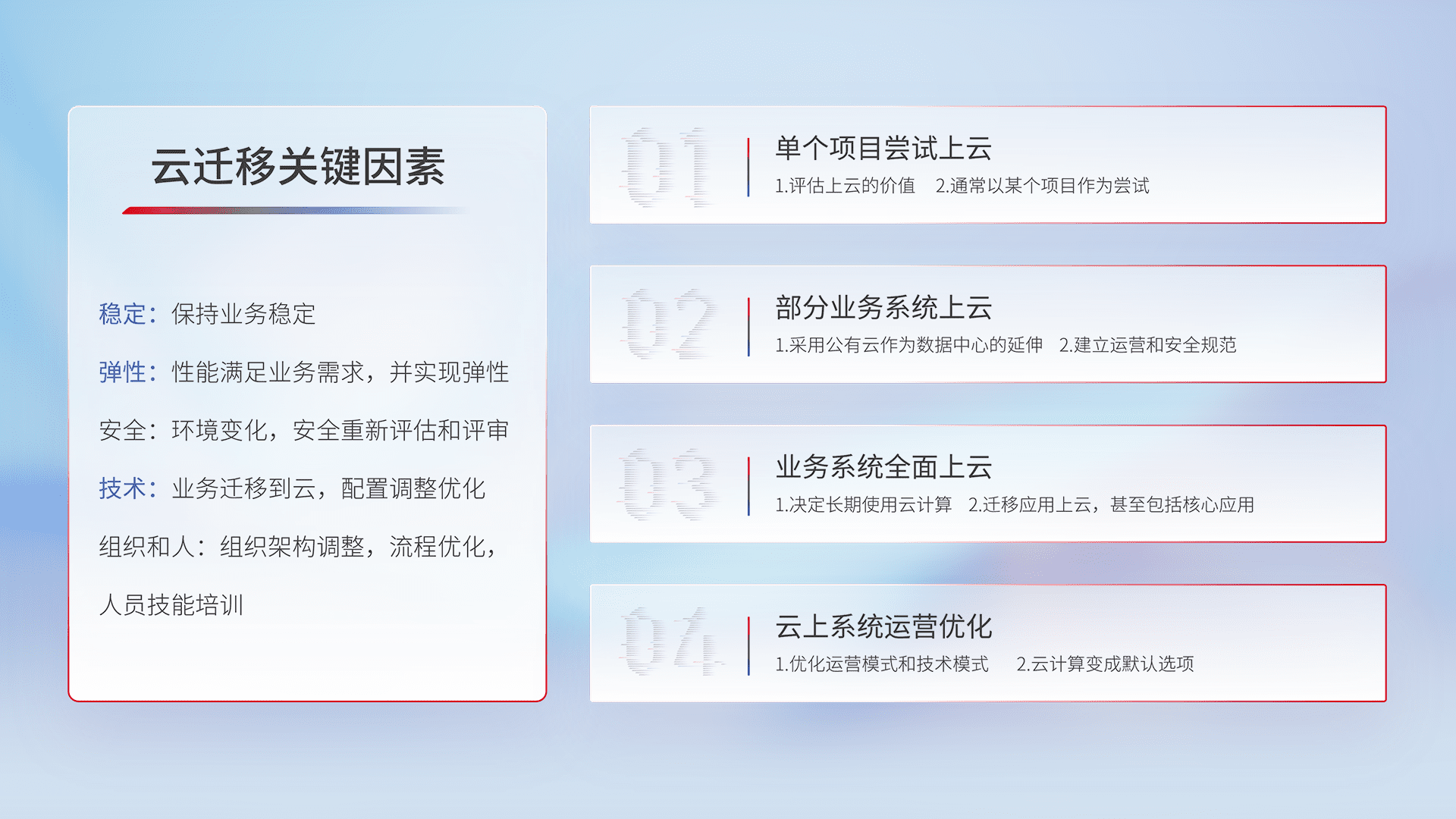 结合实际业务,,,,从规划设计、、、云平台选型、、、云原生改造、、、数据迁移、、、集成交付,,,,迁移全过程为客户识别最佳上云路径,,,做好风险识别管理,,设计网络架构、、、、身份权限、、、安全审计合规、、、、操作审计、、、日志审计、、、、监控告警策略、、多站点容灾设计等,,,对云上基础设施进行整体规划,,,,提升IT治理水平,,以满足弹性、、、高可用、、、高性能的需求。。。。