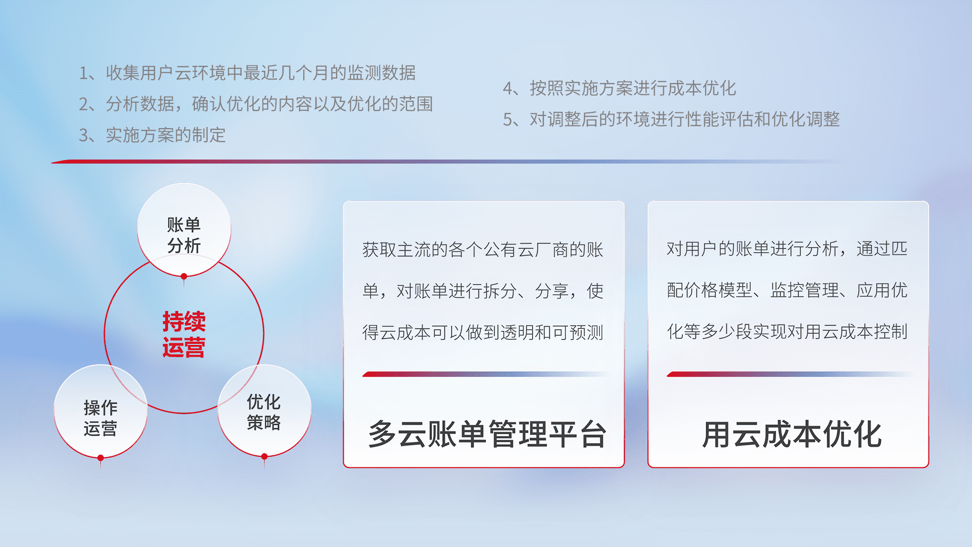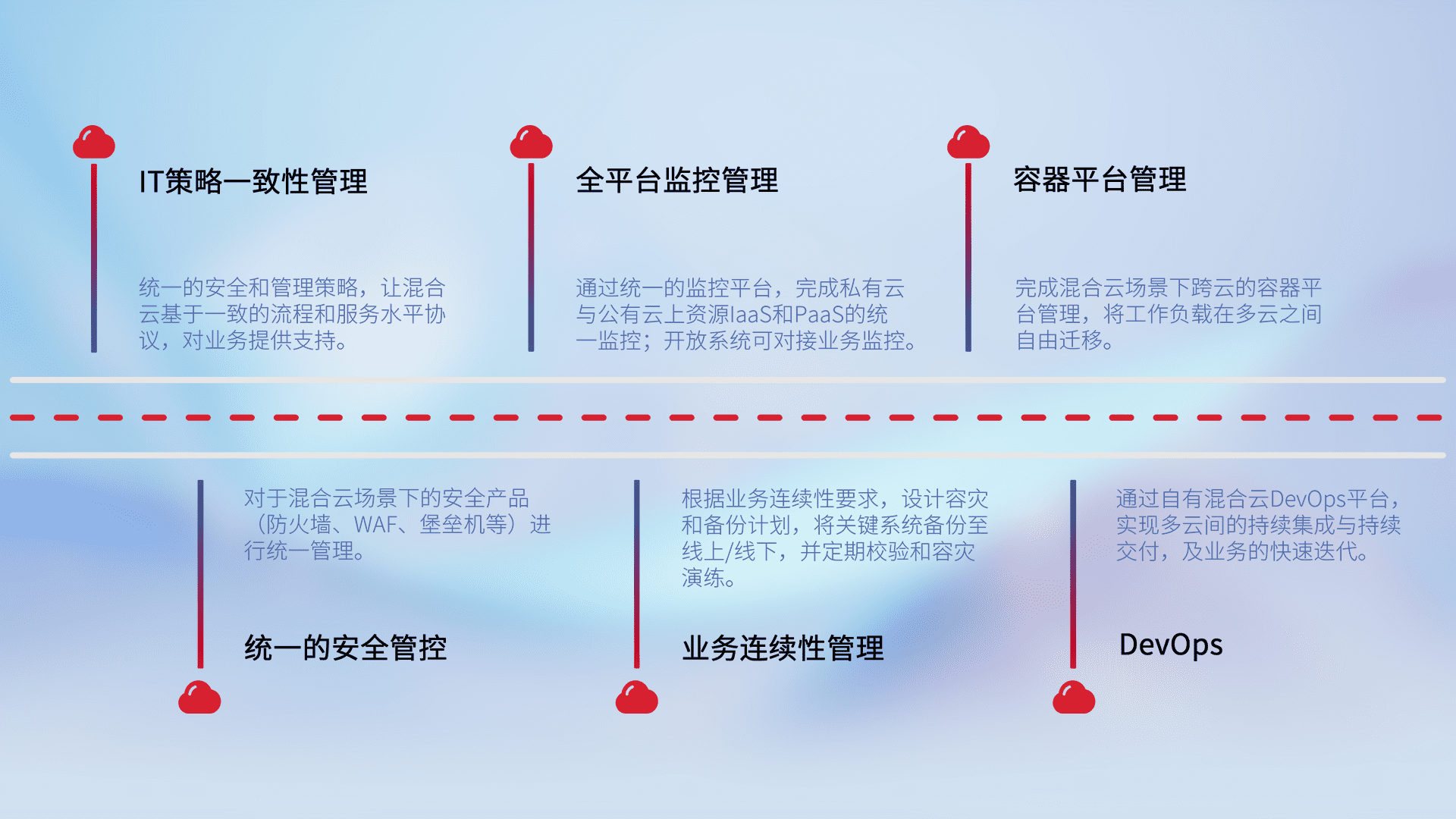 通过多云纳管,,,以统一的资源数据模型把客户的云资源进行抽象和封装,,进而实现对多云资源的统一操作,,,,保障云资源管理的可靠性、、、、稳定性与可用性。。。量身定制化运维内容,,,配置、、、开发运维、、、补丁管理、、备份、、监控、、认证和访问管理、、、、审计和日常巡检等,,,,保障在用云过程中的可靠度,,,,稳定度以及高可用率。。