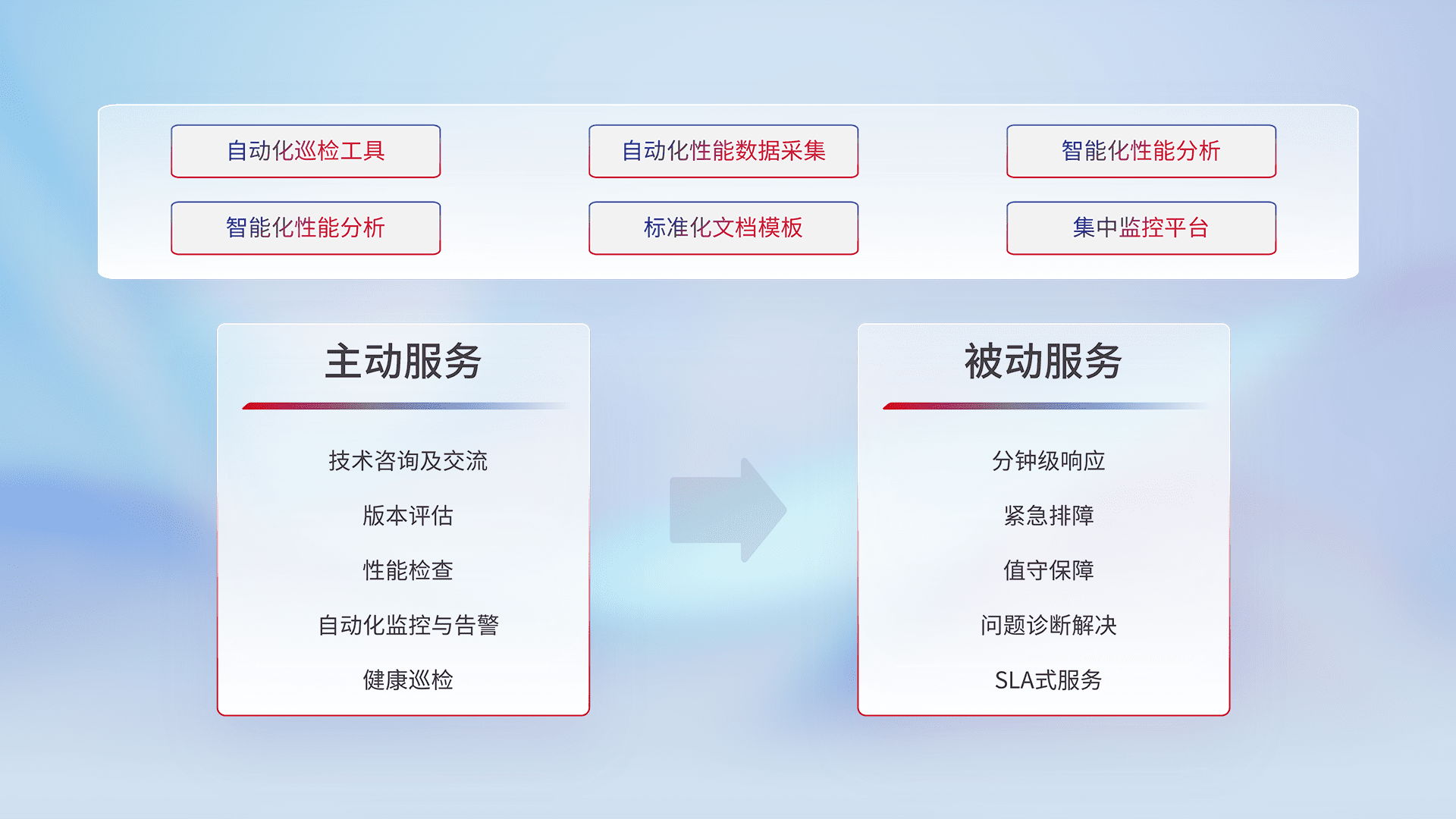 智能化工具和标准化文档,,,保障服务质量,,,,提供主动服务(包含技术咨询、、版本评估、、、、性能检查、、自动化监控与告警、、健康巡检)和被动服务包含(分钟级响应、、紧急排障、、值守保障、、问题诊断解决、、、SLA服务)。。。。